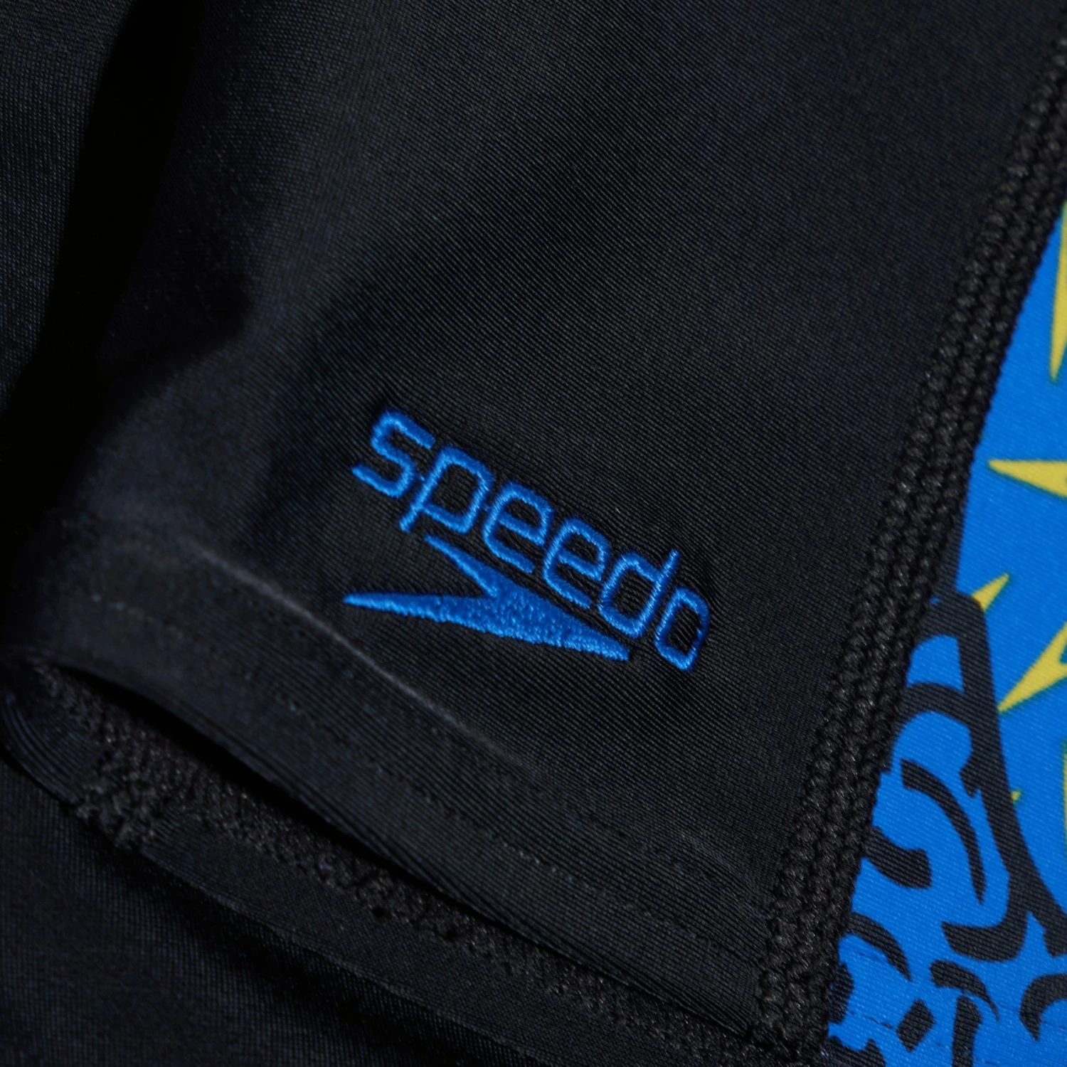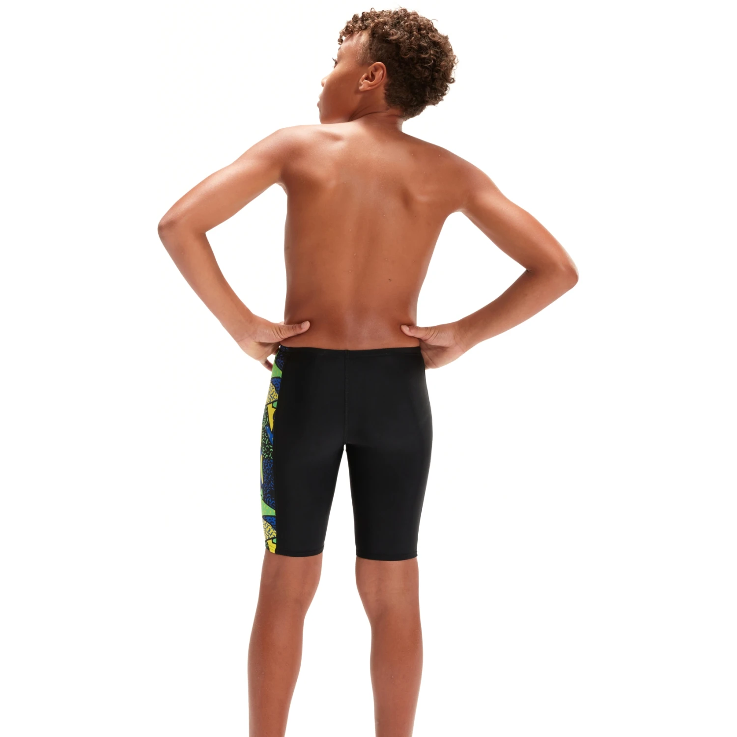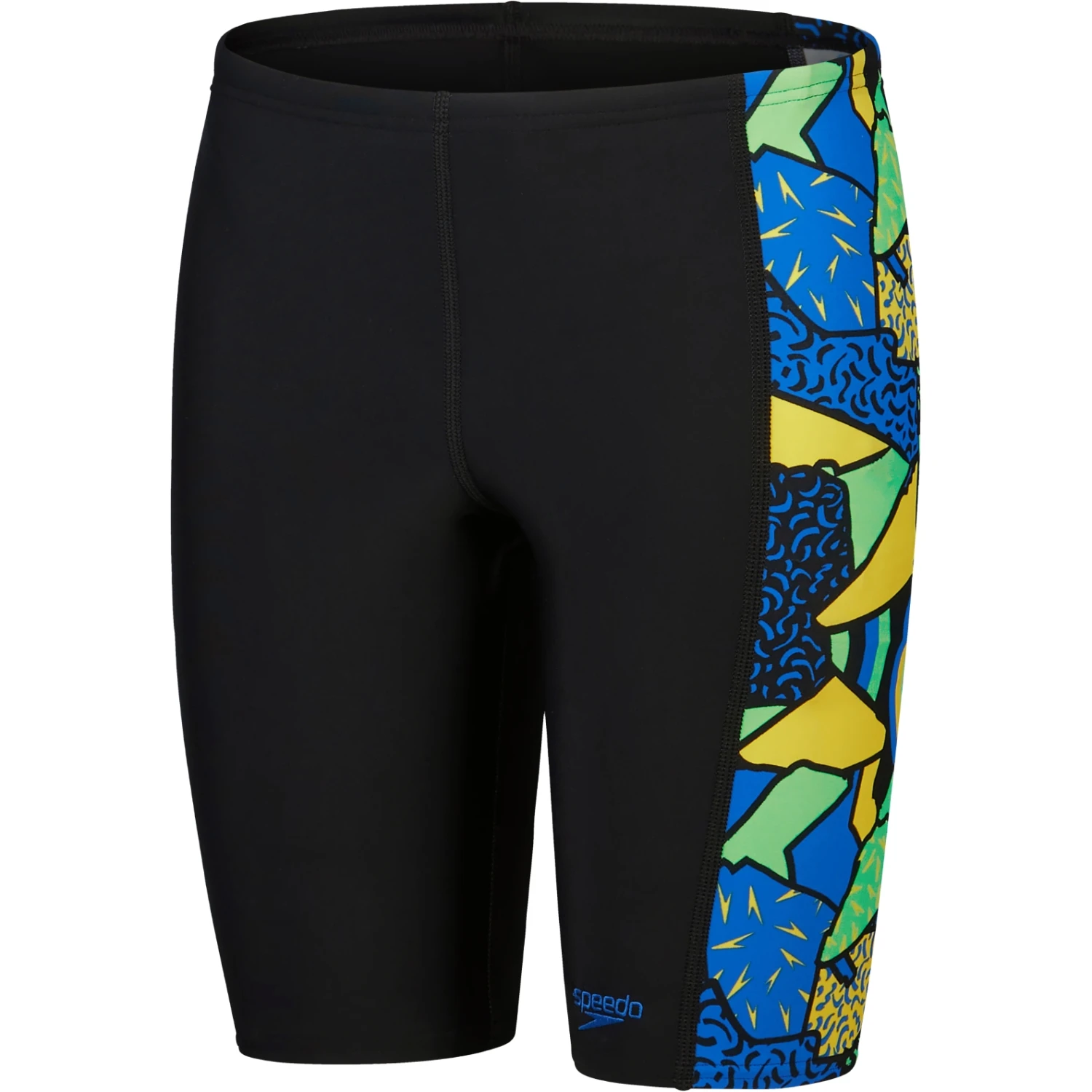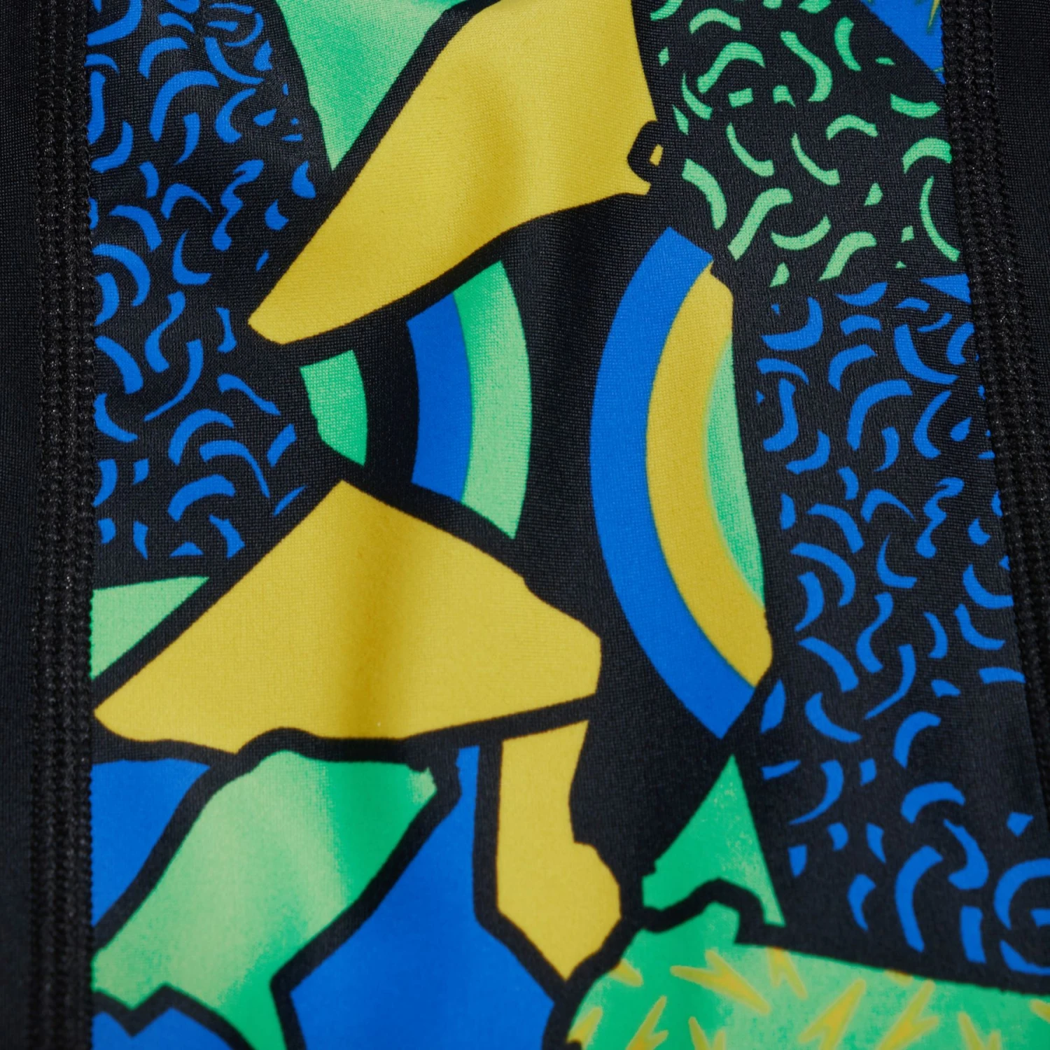 Stijl en comfort voor klasse en training. Straal vertrouwen uit met deze stijlvolle zwarte jammer, met een zijontwerp van onze energieke abstracte print in helder geel, groen en blauw. De jammer is gevoerd aan de voorkant voor comfort en bescheidenheid en heeft een intern trekkoord zodat uw kind zich kan aanpassen voor een veilige en comfortabele pasvorm.
