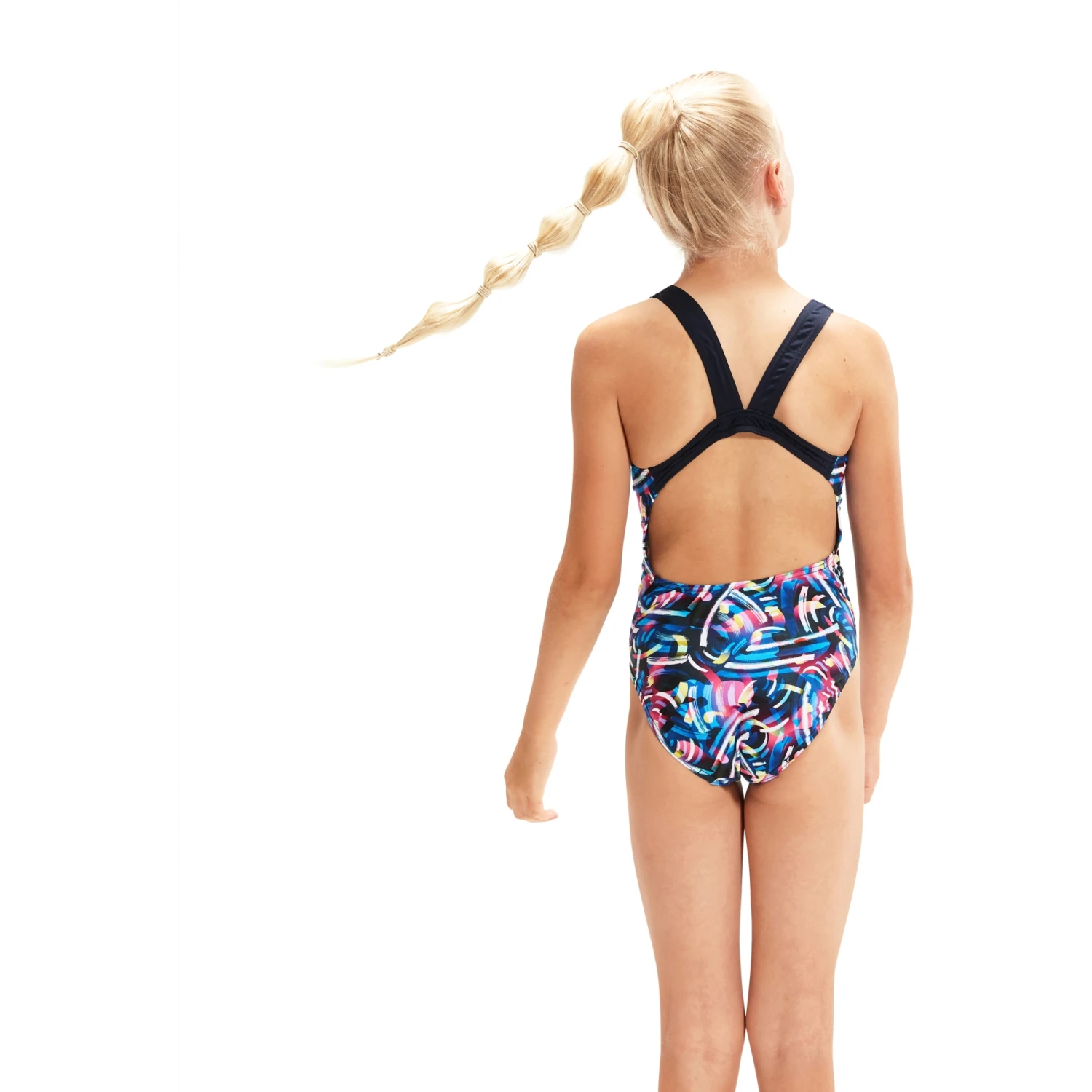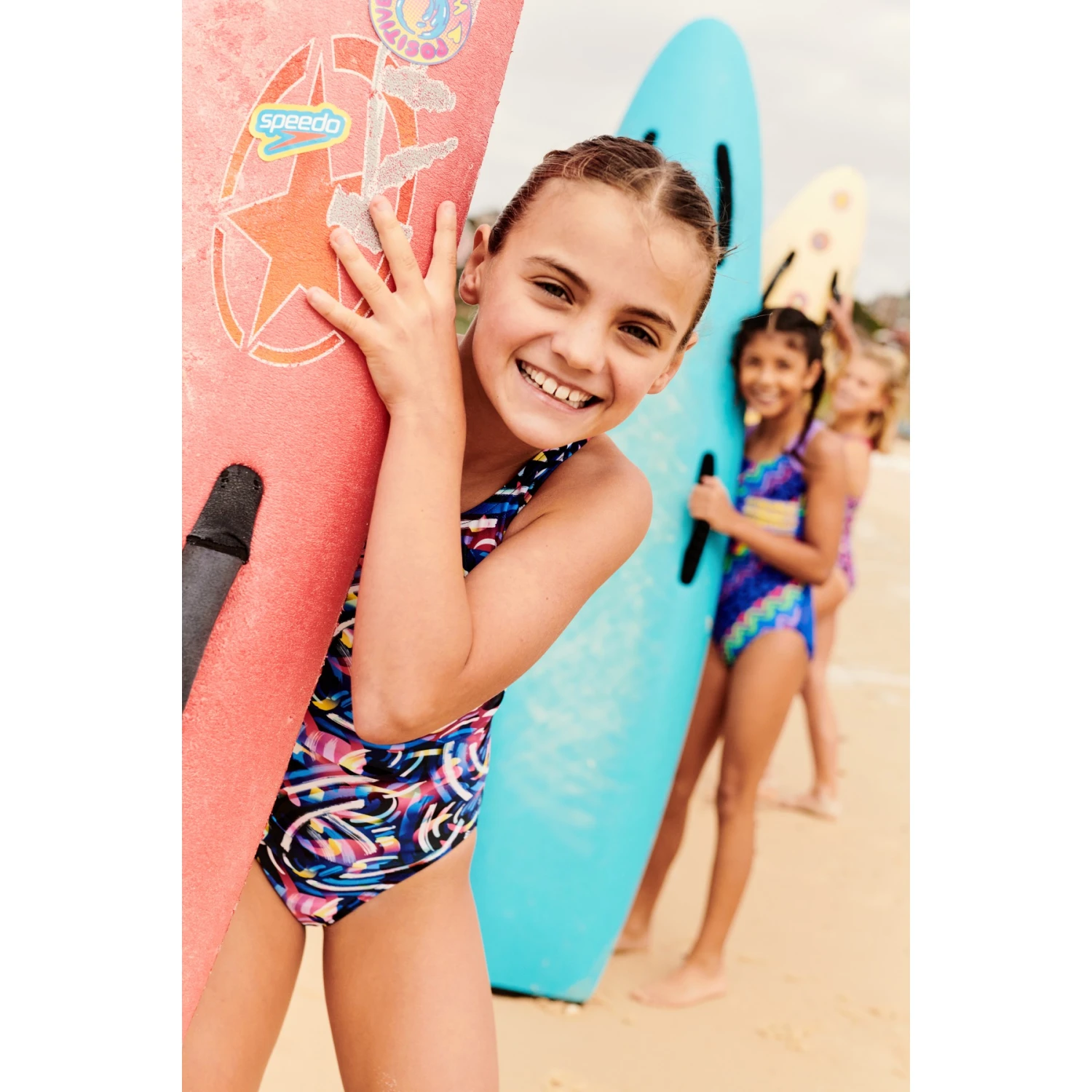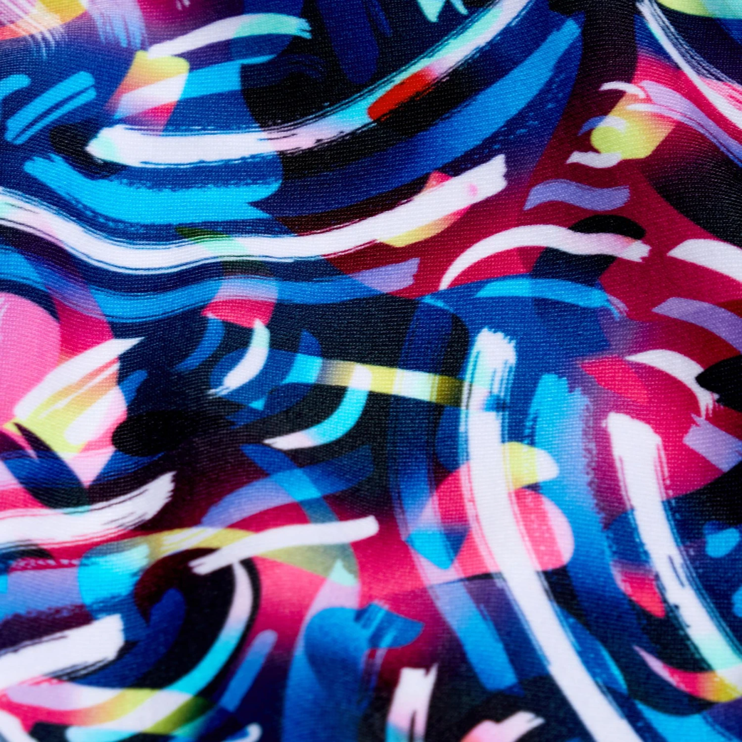 Dit kleurrijke en leuke leaderback zwempak heeft een kleurrijke digitale print met een penseelstreek effect. De leaderback stijl is perfect voor training en bevat V-vormige bandjes om jonge zwemmers een volledig bereik van de schouderbeweging in het zwembad te geven.