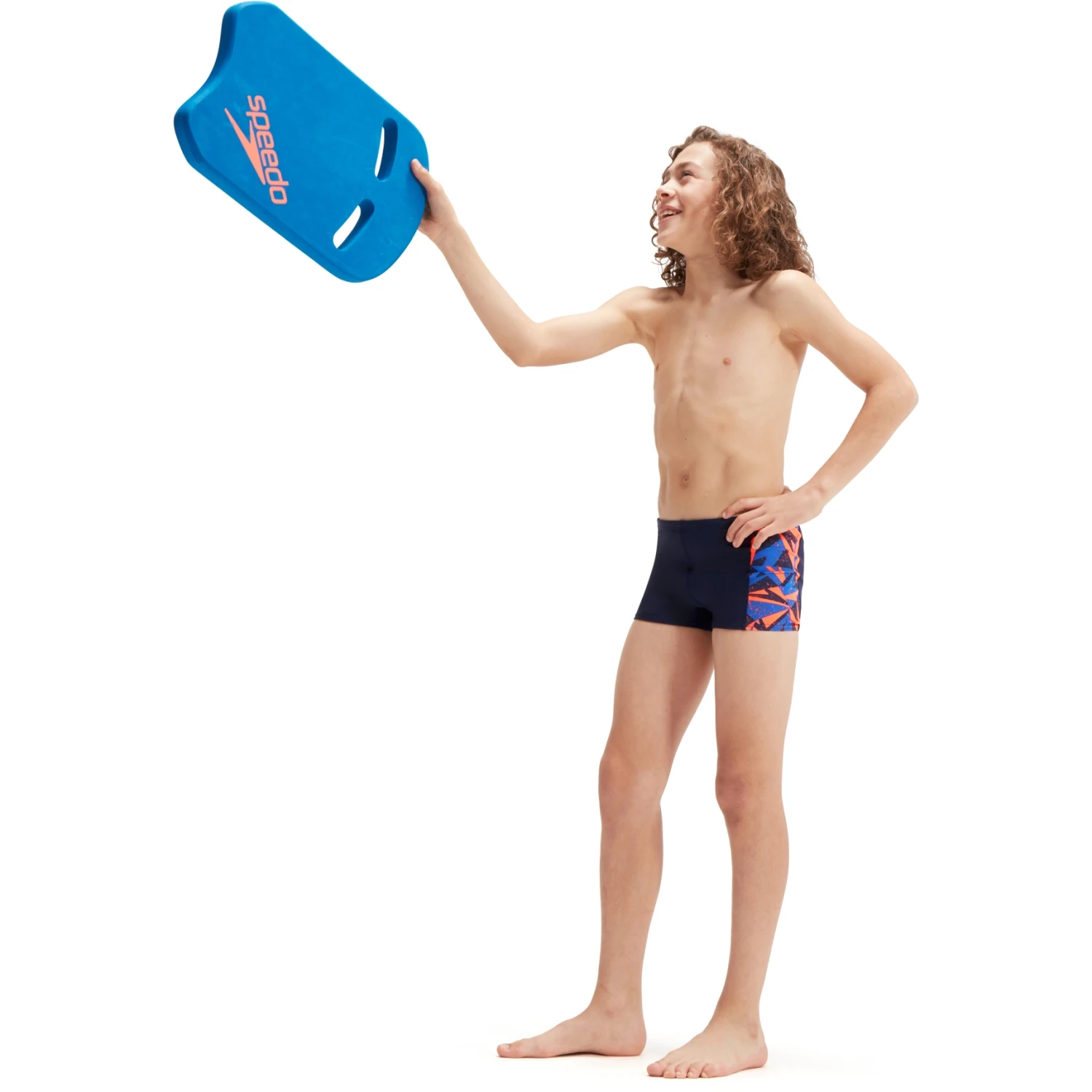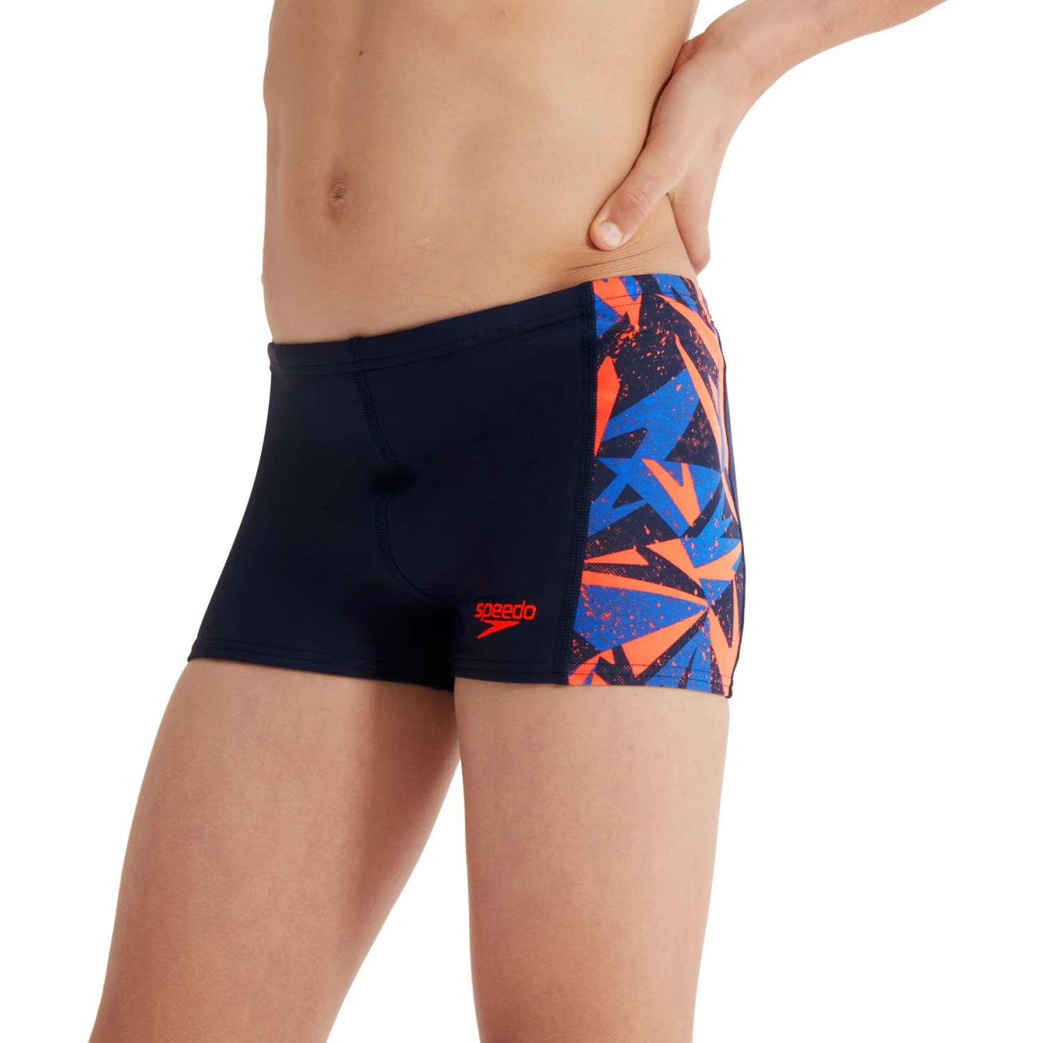 Legendarische Speedo-stijl. De sportieve, marineblauwe aqua shorts presenteren zich met een zij-inzet van de “Shattered” Boom logo-opdruk. De voering aan de voorkant garandeert het beste draagcomfort en het interne trekkoord zorgt voor een optimale pasvorm voor jonge zwemmers.