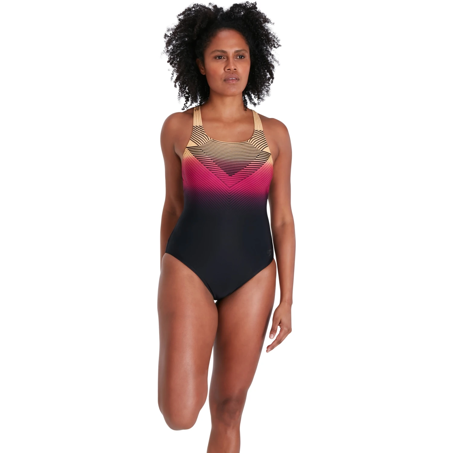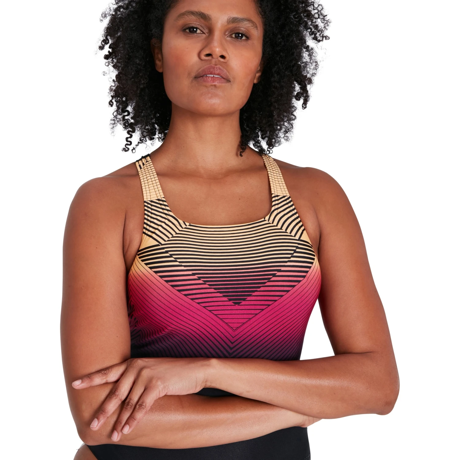 Zwem je een weg door je training met energie en geweldige afdrukken. Dit prachtige Medalist zwempak heeft betoverende kleuraccenten in gedurfd blauw en oranje, geïnspireerd op beweging en geluidsgolven.