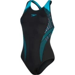 Stijlvolle zwemkleding. Train in het flatterende zwarte Laneback zwempak met contrasterende turquoise bandjes en een subtiel lila plastisol curve detail. De mid-cut been en borst onderband houden u comfortabel en ondersteund tijdens uw fitness training.