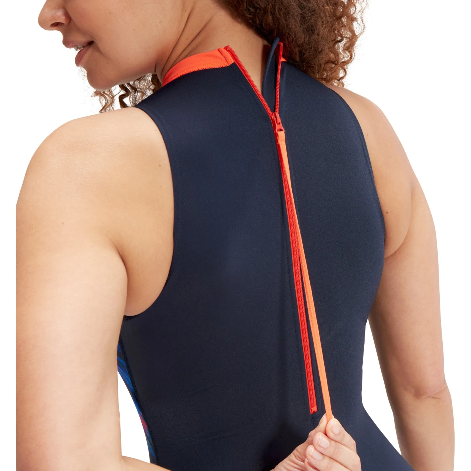 Een comfortabele onderbusteband zorgt voor een ondersteunende pasvorm, zodat u zich kunt concentreren op uw prestaties, terwijl de ritssluiting een verlengde trekker bevat voor gemakkelijk verschonen. Het pak is ontworpen om duurzaam en milieuvriendelijker te zijn, met onze nieuwe ECO Endurance + MAX-stof, die 100% chloorbestendig is, snel droogt en gemaakt is van 100% gerecycled afval na consumptie.